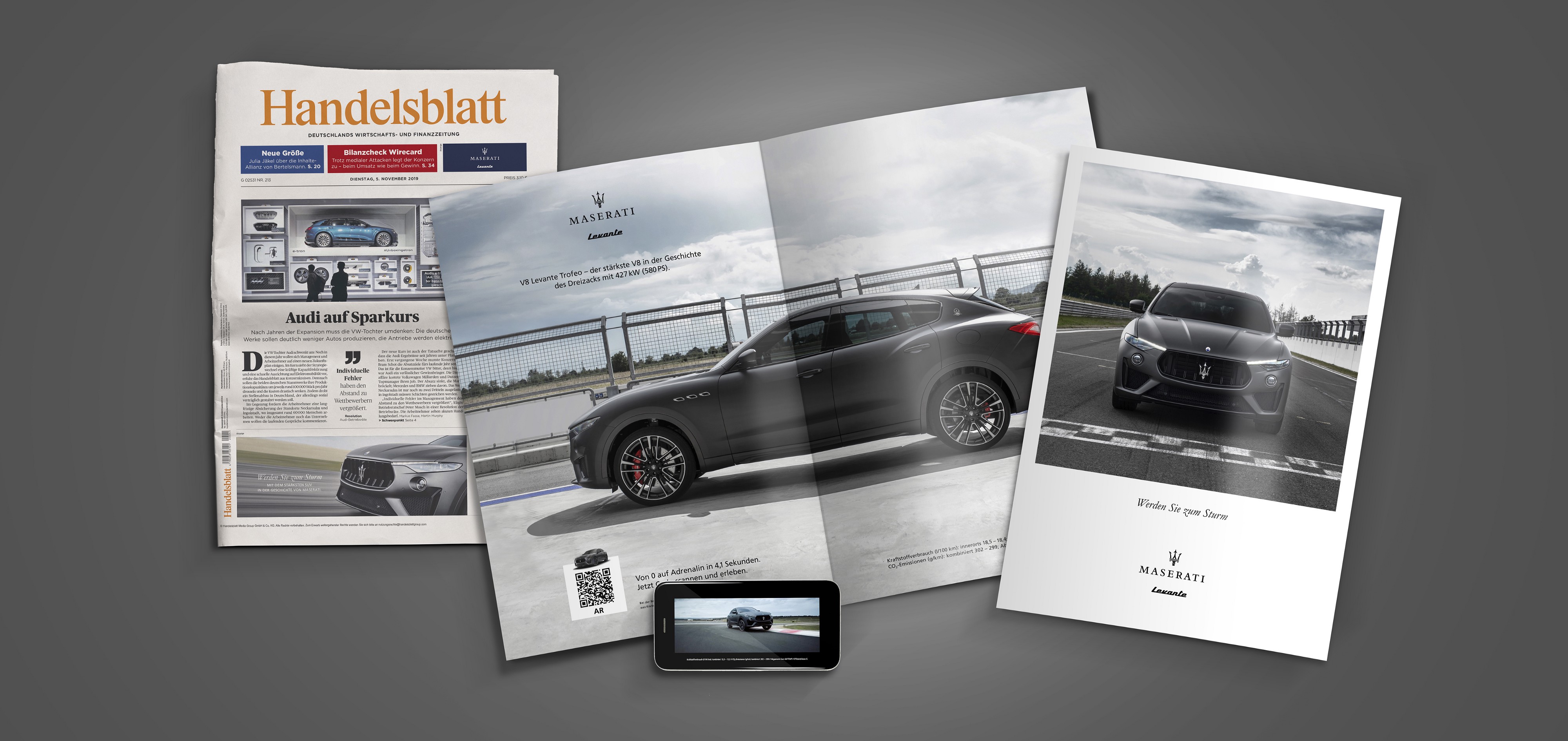 German-based agency HERREN DER SCHÖPFUNG created a WebAR-activated print ad to showcase the new Maserati Levante Trofeo 580 hp. The double-page spread, which appeared in German publication Handelsblatt, transforms into a captivating augmented reality experience when the user scans a QR code.